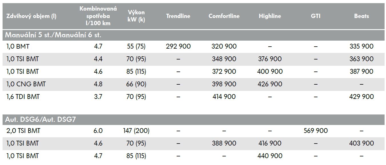 Základním motorem bude atmosférický benzinový tříválec 1.0 MPI o výkonu 75 koní. Jeho turbo verze TSI nabídne 95 nebo 115 koní. V přehledu najdete ještě jednu verzi tohoto motoru označenou 1.0 CNG. Ta bude jezdit na plyn a v maximu ze sebe vymáčkne 90 koňských sil. 1.5 TSI Evo už je čtyřválec a chlubí se výkonem 150 koní. Naftu budou konzumovat verze 1.6 TDI o výkonu 95 koní. Vrcholem nabídky je provedení GTI. To bude mít pod kapotou dvě stě koníků z motoru 2.0 TSI.