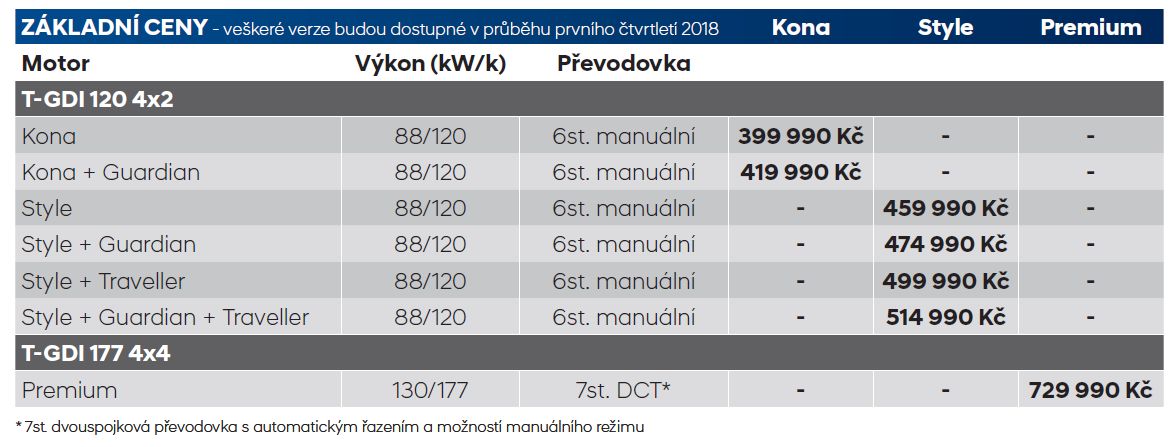 Nedávno jsem psala o Škodě Karoq a o tom, že pod její kapotou budou jen „turbené“ motory. Ani Konu nebude pohánět nic, co by nemělo turbo. Základem je verze 1.0 T-GDi s výkonem 120 koní a silou 172 Nm. Tenhle motor bude kombinovaný výhradně s pohonem předních kol a šestistupňovou manuální převodovkou. Dále tu máme provedení 1.6 T-GDi. To má s přihlédnutím k velikosti Kony opravdu působivé parametry – 177 koní a 265 Nm. Tady už jde výkon na všechny čtyři a řadí to samo díky sedmistupňové automatické (dvouspojkové) převodovce. Na stovku tahle verze zrychlí za 7,9 sekundy. Naftový motor přijde až v druhé polovině příštího roku a půjde o známý čtyřválec 1.6 CRDi o výkonu 115 koní (výhradně předokolka s manuálem) nebo 136 koní (přední pohon nebo 4×4 s automatem).