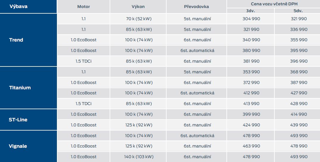 Ford Fiesta se tradičně nabízí ve tří- a pětidveřové variantě. Nejlevnější třídveřové provedení koupíte za 304 990 Kč. Nejdostupnější pětidveřovou verzi si Ford cení na 321 990 Kč a vrcholné provedení stojí skoro půl milonu.