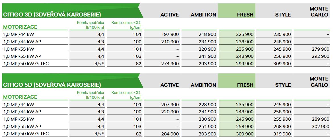Modernizované Citigo je již od minulého týdne v prodeji. Nejlevnější provedení 1.0 MPI (60 koní) Active koupíte za 197 900 Kč a jde o aktuálně nejlevnější mini autokabelku na trhu. Kompletní ceník najdete zde.